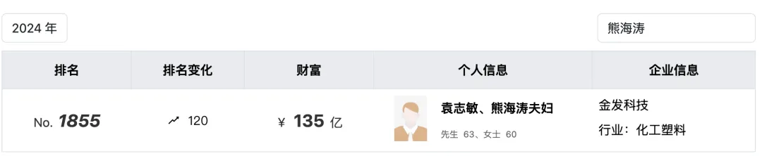2024年3月25日,胡润研究院发布《2024胡润全球富豪榜》,袁志敏、熊海涛以135亿财富位列榜单第1855位。