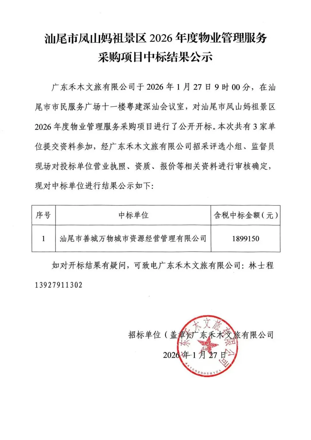 汕尾市凤山妈祖景区2026年度物业管理服务采购项目中标结果公示