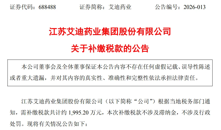 江苏艾迪药业集团股份有限公司(以下简称“公司”)根据当地税务部门通知,需补缴税款共计约 1,995.20 万元,本次补缴税款不涉及滞纳金,不涉及行政处罚。现将有关情况公告如下: