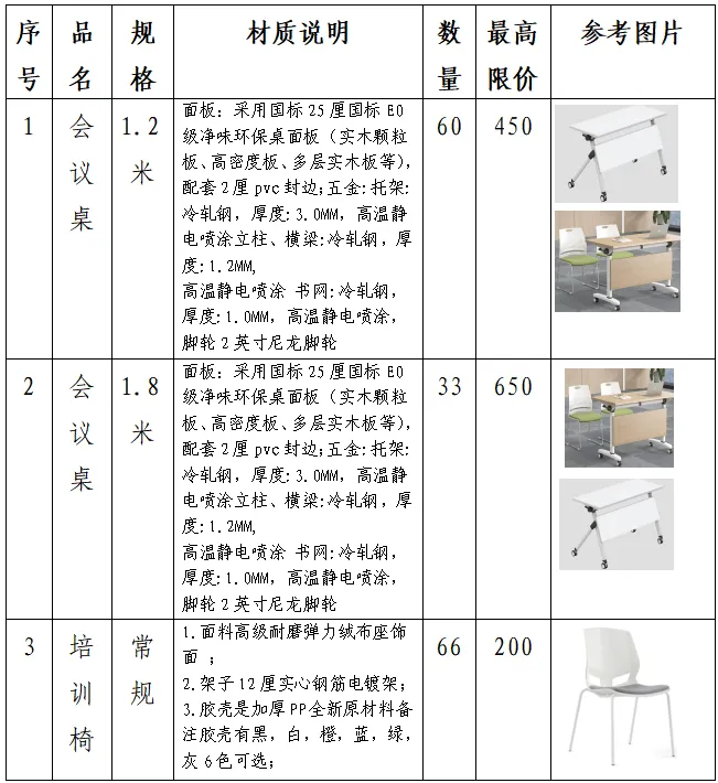 为满足我单位日常工作需求,现拟对中心会议(培训)桌椅采购项目进行公开询价,欢迎符合资质要求的供应商积极参与报价。具体事项公告如下: