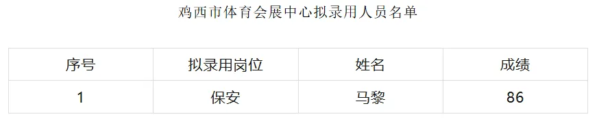 鸡西市体育会展中心公开招聘公益性岗位工作已经结束,经过报名、资格审查、面试环节,现将拟录取名单及总成绩(附件)予以公示。