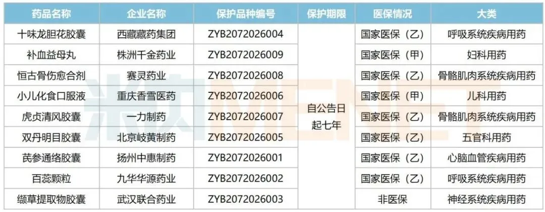 1月20日,国家药监局发布公告,批准西藏藏药的十味龙胆花胶囊、株洲千金药业的补血益母丸、赛灵药业的恒古骨伤愈合剂、重庆香雪医药的小儿化食口服液、一力制药的虎贞清风胶囊和北京岐黄制药的双丹明目胶囊为首家中药二级保护品种。今年以来,已有9个品种获批首家中药二级保护,均为独家品种(含独家剂型)。(国家药监局)