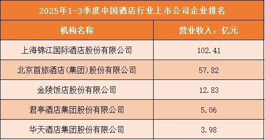 根据申万行业分类,2025年1-3季度中国酒店行业上市公司按营业收入排名如下:(A股上市公司)
