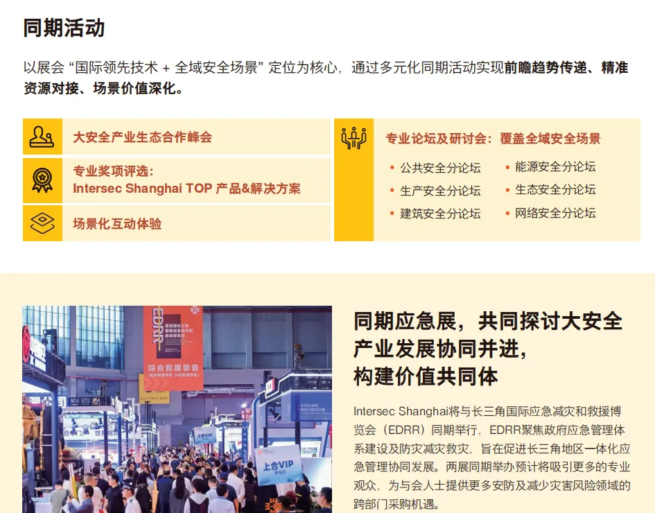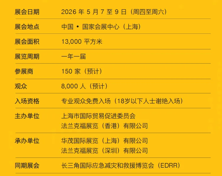 主办单位:上海市国际贸易促进委员会、法兰克福展览 (香港) 有限公司、华茂国际展览 (上海) 有限公司 承办单位:法兰克福展览 (深圳) 有限公司 同期展会:长三角国际应急减灾和救援博览会(EDRR)
