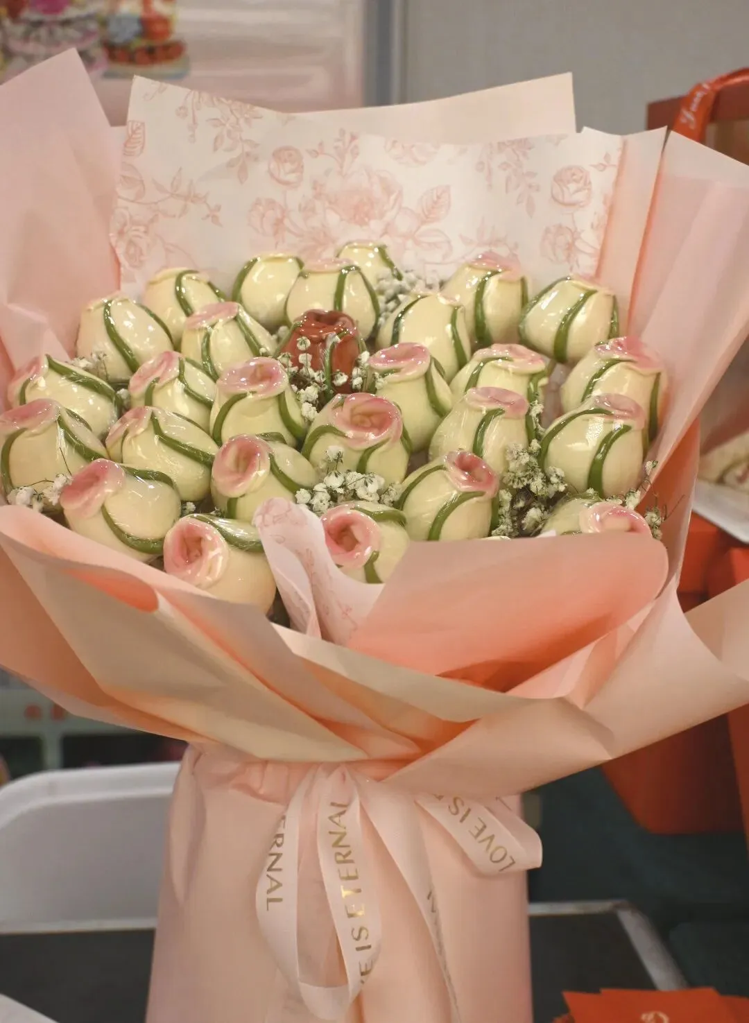 花馍花束用菠菜汁调出鲜绿花萼,火龙果汁晕染粉红花苞,全程无人工色素,纯手工揉制出饱满的玫瑰造型。打破传统花馍的仪式感,把浪漫做成可食用的花束。无论是节日送礼、约会伴手礼,还是日常给生活添点仪式感,都能传递“日子如花般绽放”的美好祝愿,满足消费者对独特、有纪念意义的爱情礼赠需求。