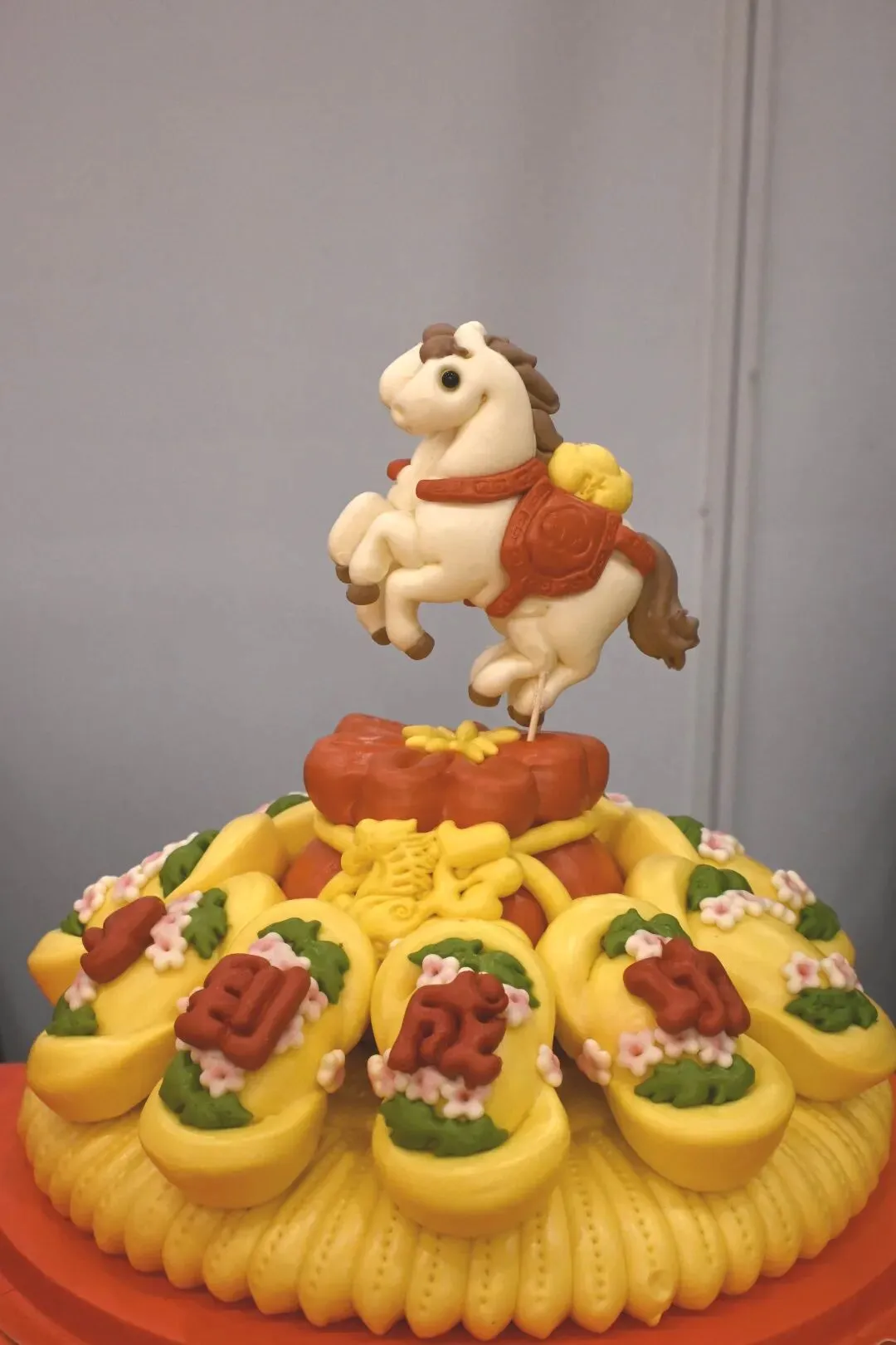 在“马到成功”花馍中,金灿灿的聚宝盆造型是核心设计,寓意将福气与财气尽数汇聚家中,象征生活富足美满、蒸蒸日上。顶部栩栩如生的骏马造型呼应“马到成功”的主题,寄托着事业顺遂、前程腾飞的祝福。