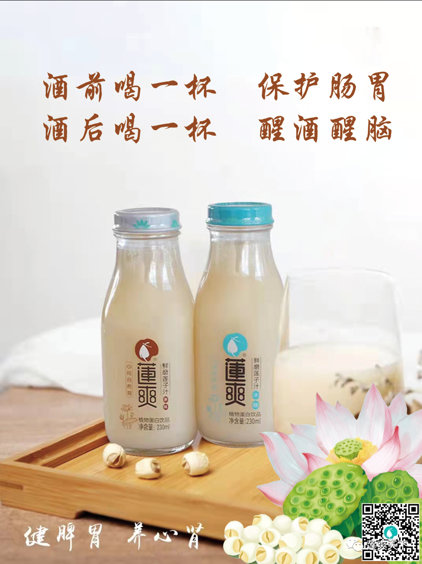 “莲爽”莲子汁含有植物蛋白、多种人体必需氨基酸、维生素、微量元素、莲子多酚等营养物质,具有益气安神、健脾养胃等作用