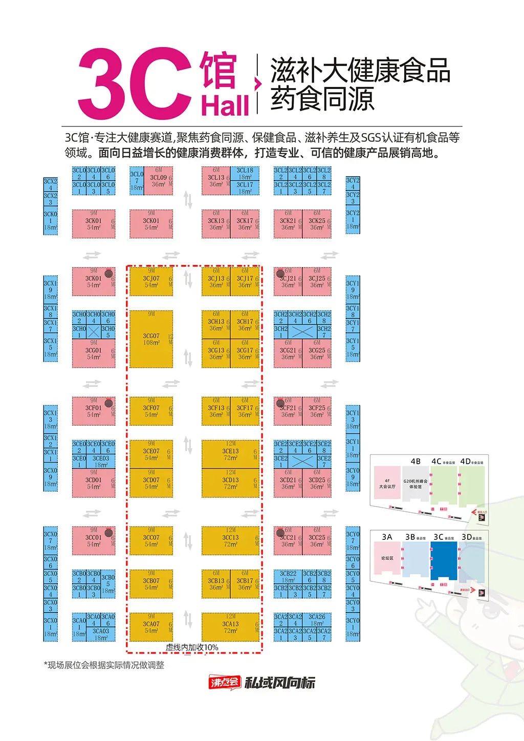 3B 馆大健康/食品饮料水果蔬菜/生鲜水产农特产品 3C 馆大健康滋补/药食同源保健食品/SGS有机食品 3D 馆(地方特产)地方特产/地标美食/非遗老字号
