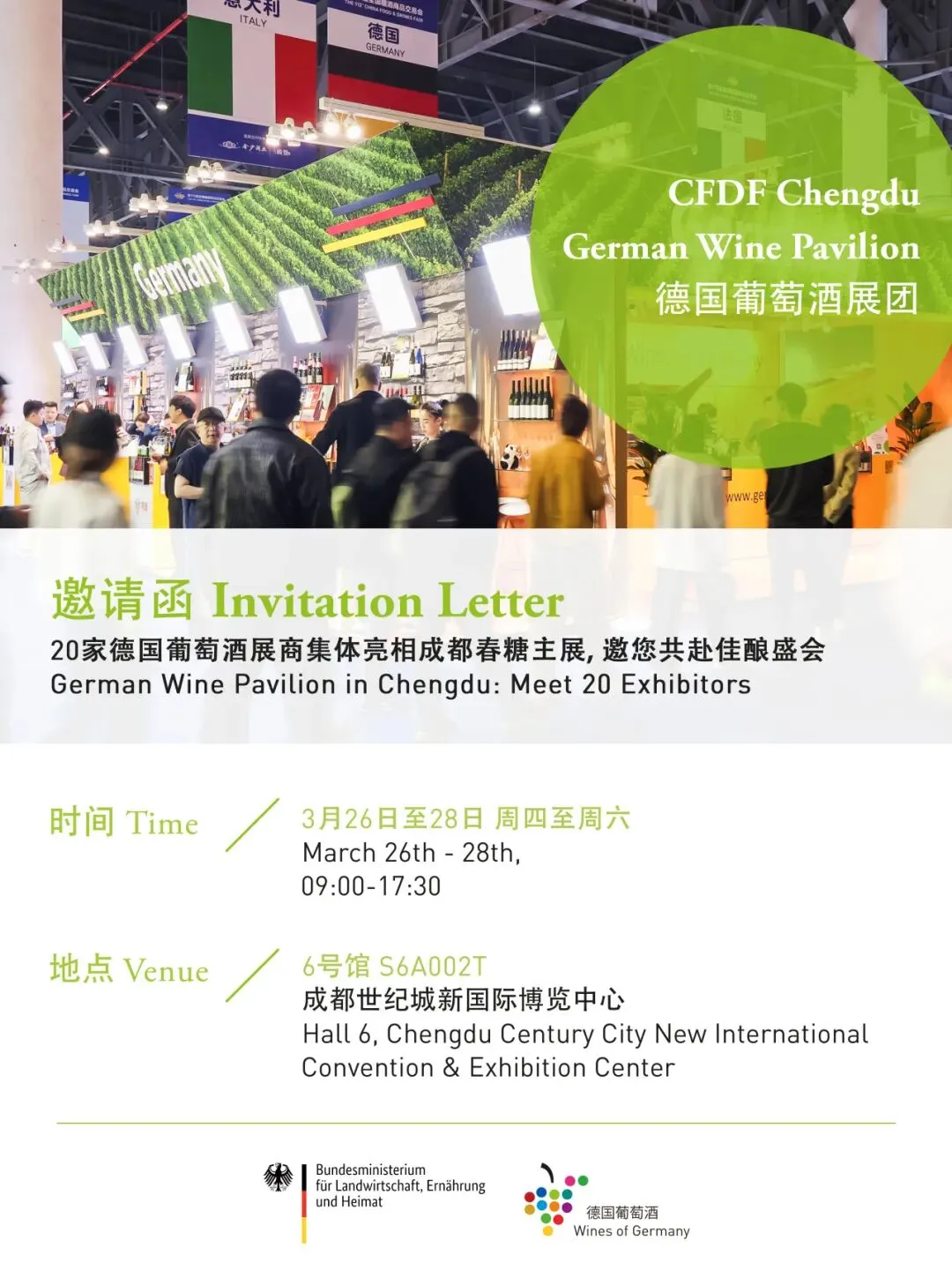 德国葡萄酒国家展团将闪耀亮相成都世纪城新国际会展中心6号馆国际葡萄酒与烈酒馆,一如既往获得德国官方支持,由德国农业、食品及区域发展部 (BMLEH) 牵头组织、德国葡萄酒协会协办,汇聚20家德国葡萄酒展商,诚邀业内人士莅临,把握白葡萄酒消费热潮,共同开拓德国葡萄酒在中国市场的合作新机遇!
