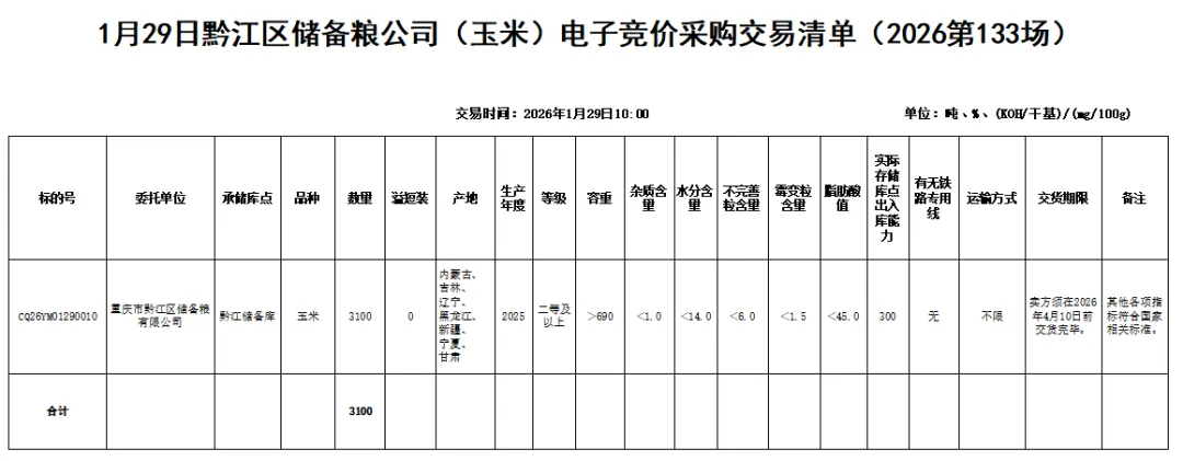 受重庆市黔江区储备粮有限公司委托,重庆市粮油批发市场有限责任公司(即国家粮食重庆交易中心,以下简称“批发市场公司”)定于2026年1月29日10:00举办黔江区储备粮公司(玉米)电子竞价采购交易会,现将有关事项公告如下: