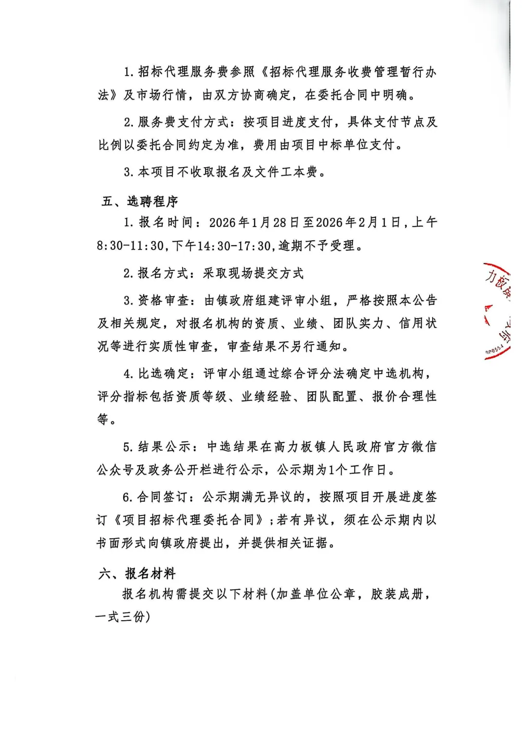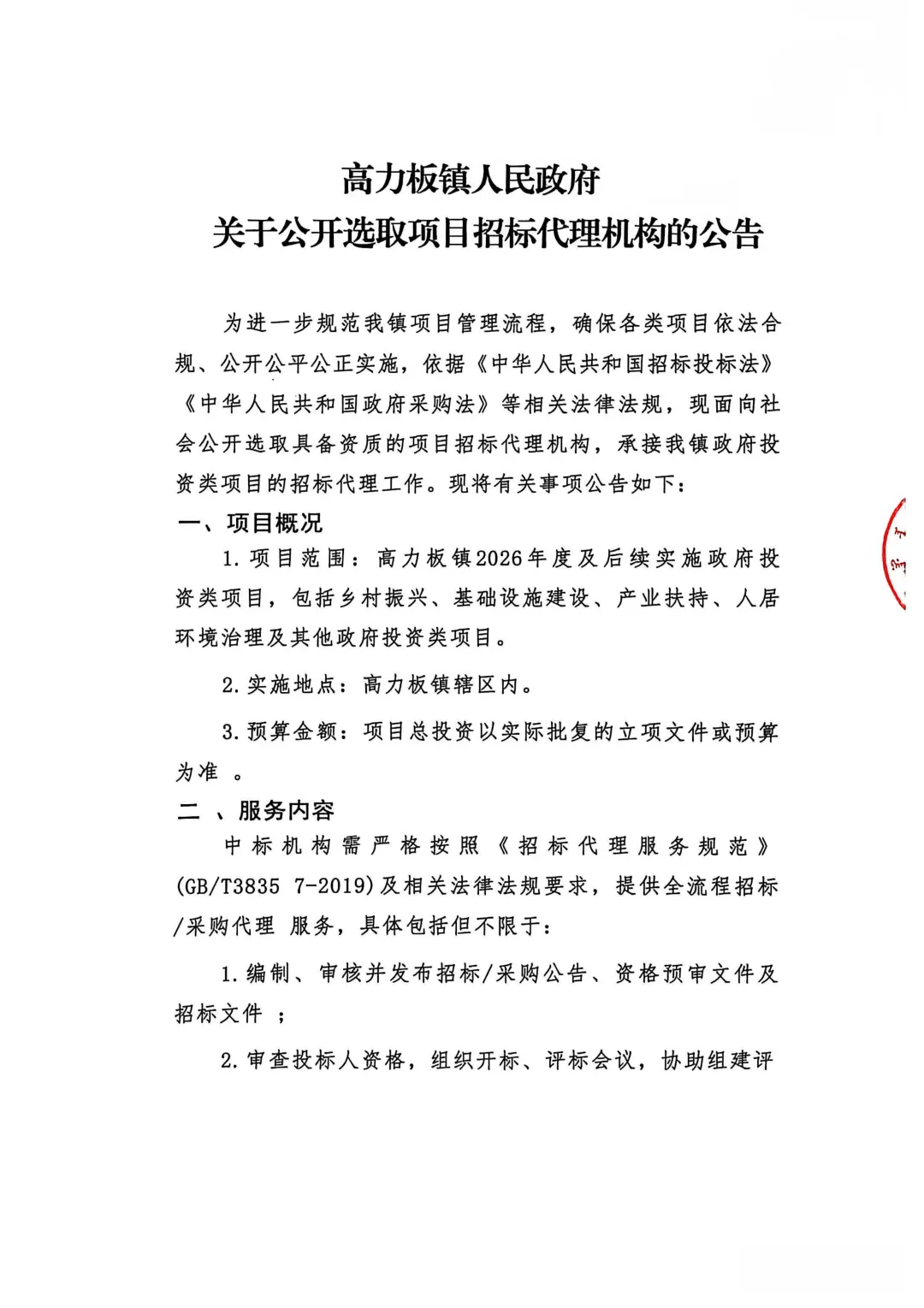 高力板镇人民政府关于公开选取项目招标代理机构的公告