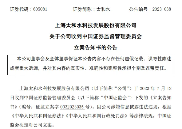 7月13日,太和水发布关于公司收到中国证券监督管理委员会立案告知书的公告。