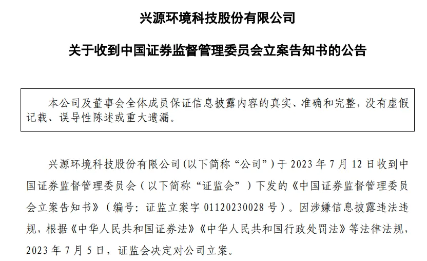 公告显示,因涉嫌信息披露违法违规,根据《中华人民共和国证券法》《中华人民共和国行政处罚法》等法律法规, 2023年7月5日,证监会决定对兴源环境立案。