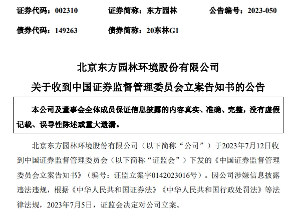 公告显示,因东方园林涉嫌信息披露违法违规,根据《中华人民共和国证券法》《中华人民共和国行政处罚法》等法律法规,2023年7月5日,证监会决定对东方园林立案。