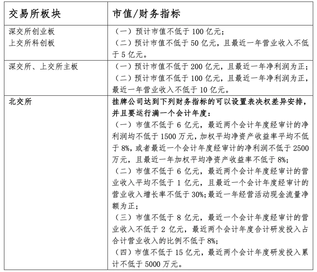 根据各证券交易所的相关股票上市规则,设置表决权差异安排的企业,若申请上市,其需满足更高的市场及财务指标要求,具体如下: