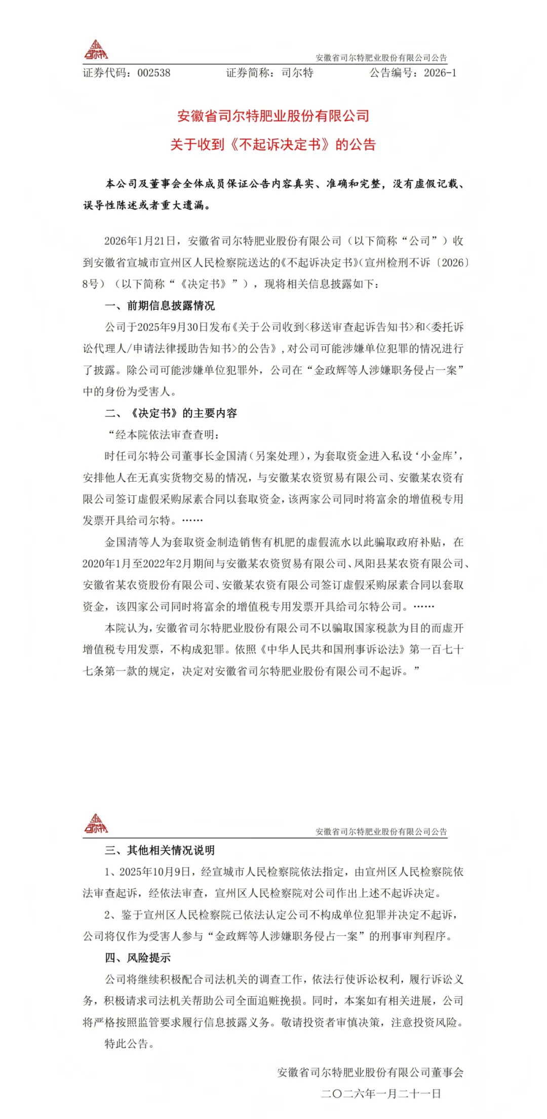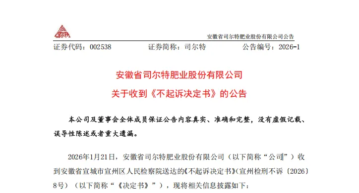 2026年1月21日,上市公司司*特(002*38)的一则公告,在企业家和财税圈里激起了千层浪。公告称,公司卷入虚开增值税专用发票案,涉案金额巨大,但最终收到了检察院的《不起诉决定书》。