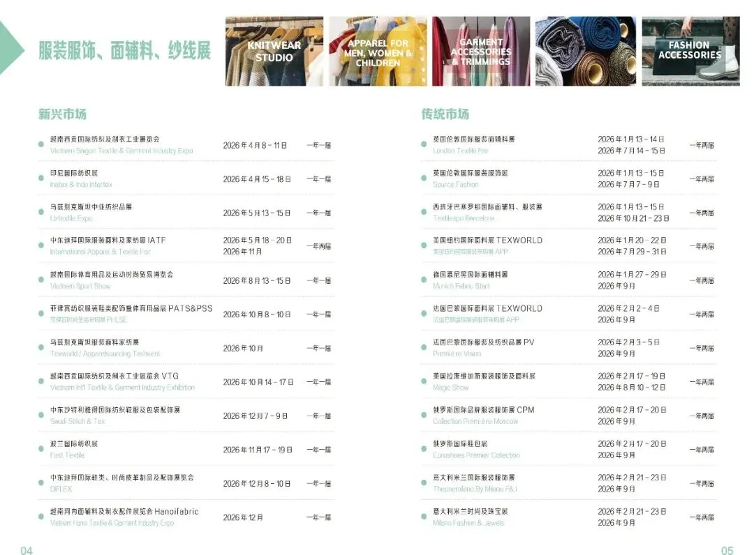 纤维纱线:棉、丝、毛、麻、氨纶、天丝、涤棉、全涤、醋酸、尼龙、涤粘等。面辅料:梭织、针织、牛仔、涤纶、超细纤维、天鹅绒、Button 纽扣、拉链、标签、肩垫等。其它:人造裘皮、人造革、坯布、刺绣等。纺织服装机械与配件:纺纱、机织、针织、印染、缝制、整烫设备、CAD/CAM;皮革机械及附件,制鞋机械及附件等化工染料:酶,助剂,染料等