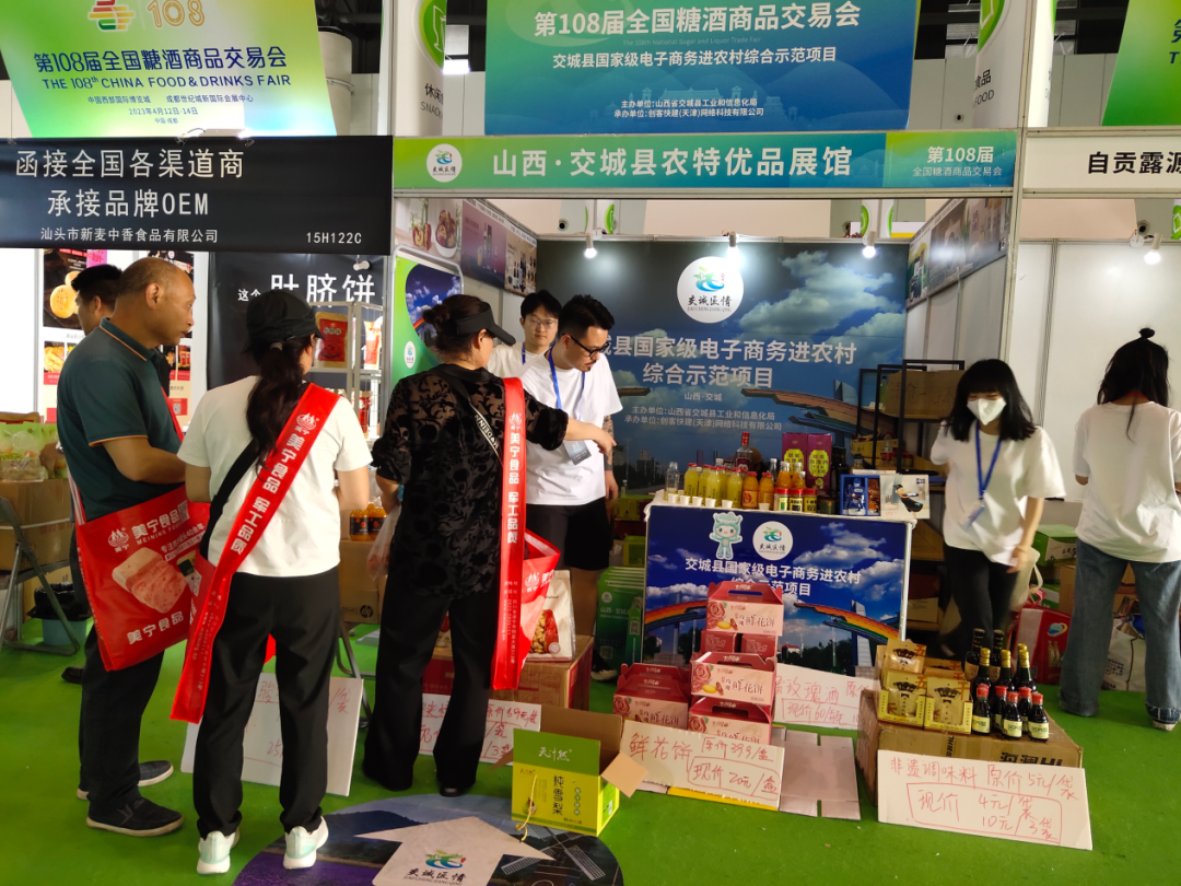 此次糖酒会,交城县的沙棘、骏枣、傅山调料、阳泉市郊区的玉露香梨、西南舁苹果、七凤帝玫瑰花饼、晋阳府醋、保德县的海红果、碗托、灵丘县的黄烧饼、苦荞产品、怀仁市的羊杂羊肉、杂粮、五寨县的小米、甜糯玉米、大宁县的蜂蜜、苹果、武乡县的小米、辣椒酱、黑花生、乡宁县的核桃、蜂蜜、花椒、永和县的核桃、杂粮、红枣、槐花饼、迁西县的杏干、板栗、薯一红薯干、枣强县的香油麻酱、无抗鸡蛋、涿鹿县的苦荞挂面、小米、杏仁等产品集中亮相,让更多人体验到了山西、河北各县农特产品的风土魅力,感受到了国家级电子商务进农村综合示范项目和乡村e镇项目的发展成果,进一步提升了各县域农特产品形象,对打造地区特色品牌优势、促进各县域当地特色产品的市场流通起到了重要影响。在展会现场,各县域特色农产品展示在全国各地消费者面前,吸引了诸多参会者前来围观、试吃,众多经销商、渠道商、批发商等对红枣、枣夹核桃、沙棘汁、醋、苦荞产品、甜糯玉米、杏干、板栗、杂粮等表现出极大兴趣和合作意向。在展会现场,交城县特色农产品展示在全国各地消费者面前,吸引了诸多参会者前来围观、试吃,众多经销商、渠道商、批发商等对天骄红枣夹核桃、待见沙棘汁、沙棘原浆、天之然炖雪梨、起一苦荞醋、傅山调味料表现出极大兴趣和合作意向。除此之外,在展位现场还进行直播带货,进一步扩大宣传力度,助力产品销售。风土献礼,佳品纷呈,精彩无限。各县携多款具有当地特色的农特产品参展糖酒会,是助推当地农产品走出县域、走向全国、面向世界的一次重要实践。此次糖酒会,不仅拓宽了各县域优质农产品的外销渠道,打响了各县域优质农产品在全国市场的品牌和产品知名度,同时也加强了各县域本土企业与各地商贸企业的合作交流。未来,各县域将继续以实际行动践行使命担当,勤耕不倦农产品上行,让更多的县域产品走出去,走具有县域特色的乡村振兴之路,助力当地经济高质量发展,奋力谱写新时代高质量发展新篇章!