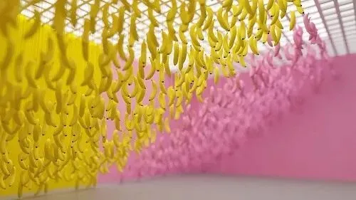 这里足足挂了有一千根香蕉呐!香蕉们高低错落,粉色黄色交相辉映,就问你浪不浪漫!抬头一望准让你眼花缭乱。看看能否找到最特别的那根香蕉?