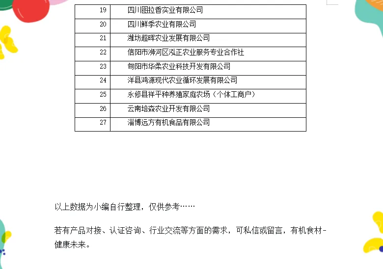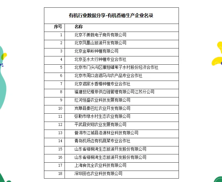 中国的香椿产业目前正处于从传统种植向现代品牌化、产业链化加速转型的阶段,一方面各产区普遍重视技术应用,如设施栽培、矮化密植、保鲜技术、立体套种等,增加生产端供应链的长度和稳定性,另一方面,各产区通过深加工等方式,探索产业链的延伸价值。同时,通过有机认证、地标产品等增加品牌价值构建。目前,经过中国有机认证的香椿生产加工企业共有27家,具体如下: