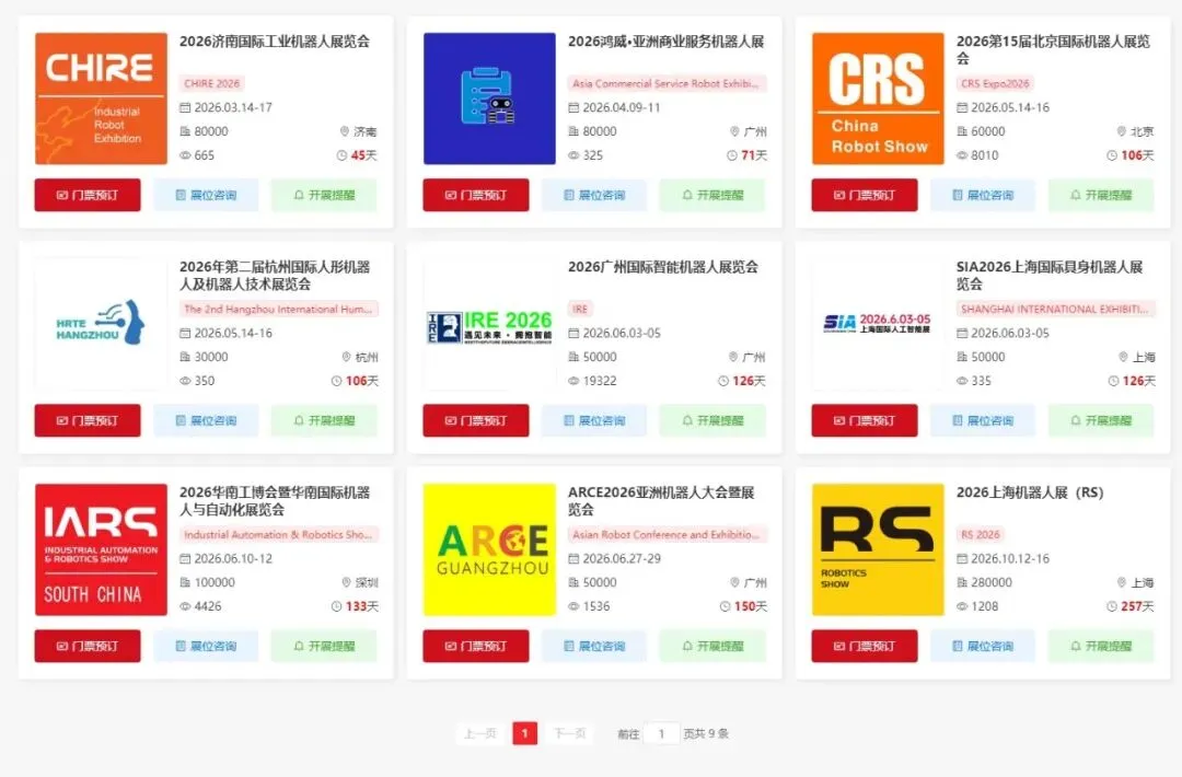 2026年全国机器人展会将会在哪些城市举办?小编为您提供2026年全国机器人展会时间、展馆地址以及入场门票。接下来让我们一起来了解下全国机器人展会2026年时间表!末文获取2026机器人展门票预约入口~(大多门票限时免费)