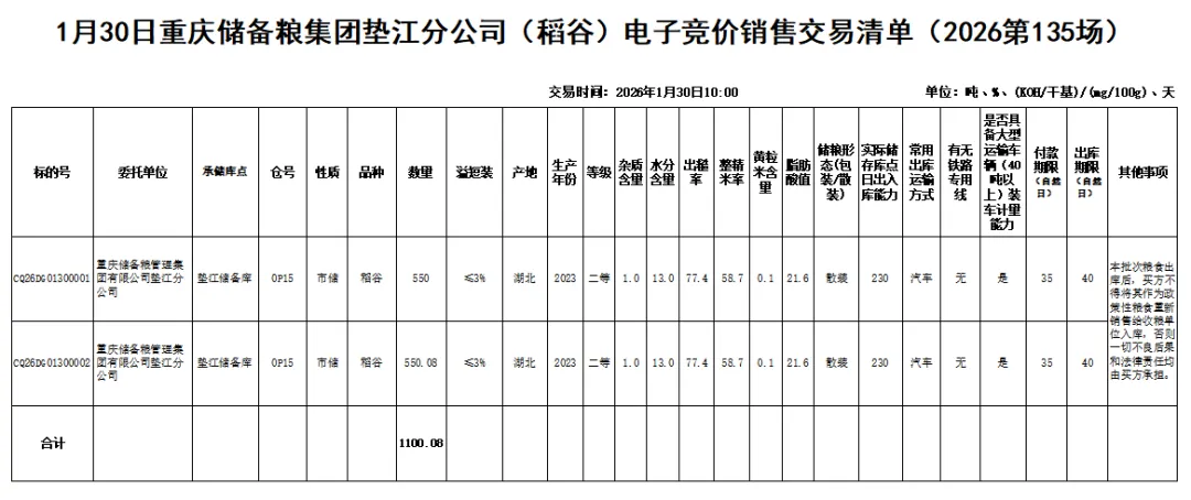受重庆储备粮管理集团有限公司垫江分公司委托,重庆市粮油批发市场有限责任公司(即国家粮食重庆交易中心,以下简称“批发市场公司”),定于2026年1月30日10:00举办重庆储备粮集团垫江分公司(稻谷)电子竞价销售交易会,现将有关事项公告如下:
