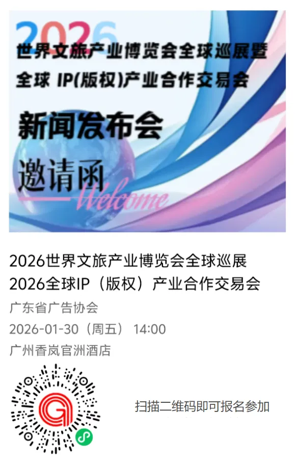 为深入贯彻落实党的二十届四中全会通过的《中共中央关于制定国民经济和社会发展第十五个五年规划的建议》中“推进文旅深度融合,大力发展文化旅游业,以文化赋能经济社会发展”的战略部署,积极响应国家推动中华文化“走出去”、支持优质IP与文旅项目出海的政策导向,由鸿威会展集团联合多家行业协会及机构,广东省广告协会支持的“2026世界文旅产业博览会全球巡展、2026全球IP(版权)产业合作交易会新闻发布会暨行业新春联谊会”,将于2026年1月30日在广州举办。