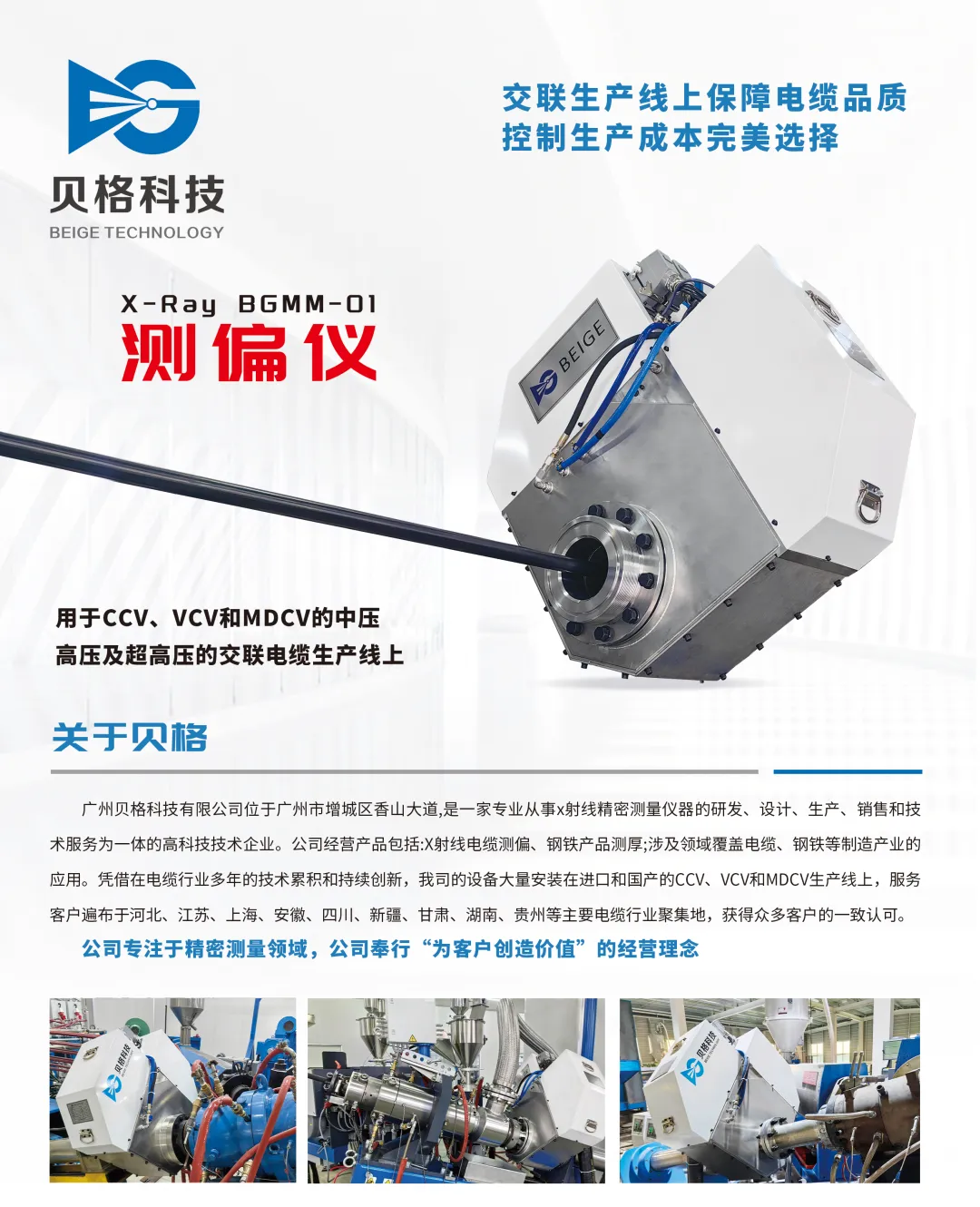 广州贝格科技有限公司位于广州市增城区香山大道,是一家专业从事x射线精密测量仪器的研发、设计、生产、销售和技术服务为一体的高科技技术企业。公司经营产品包括:X射线电缆测偏、钢铁产品测厚;涉及领域覆盖电缆、钢铁等制造产业的应用。凭借在电缆行业多年的技术累积和持续创新,我司的设备大量安装在进口和国产的CCV、VCV和MDCV生产线上,服务客户遍布于河北、江苏、上海、安徽、四川、新疆、甘肃、湖南、贵州等主要电缆行业聚集地,获得众多客户的一致认可。