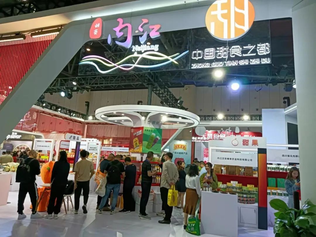 4月12日,第108届全国糖酒商品交易会在成都盛大启幕。资中县认真贯彻落实市委八届五次全会关于“做大工业”、深挖“甜城”文化、构建完善的“甜味+”产业体系、打造“中国甜食之都”的精神,认真筛选和组织重龙白酒、赵老师等4家企业23款产品参展,并在内江馆为企业搭建展区,融入资中元素,彰显资中特色,成为交易会的亮点之一。