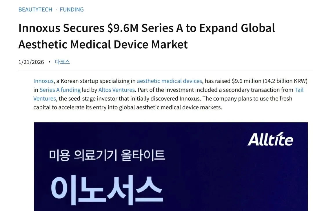 近日,韩国医美器械公司Innoxus宣布完成960万美元(约7000万人民币)的A轮融资。