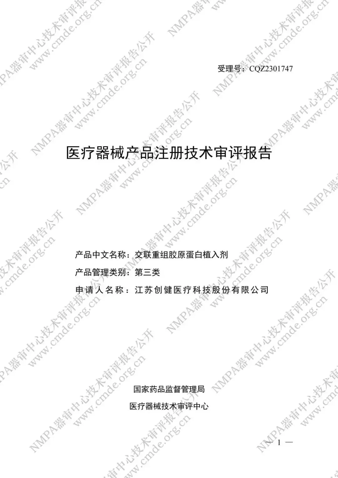 CMDE公开江苏创健交联重组胶原蛋白植入剂审评报告