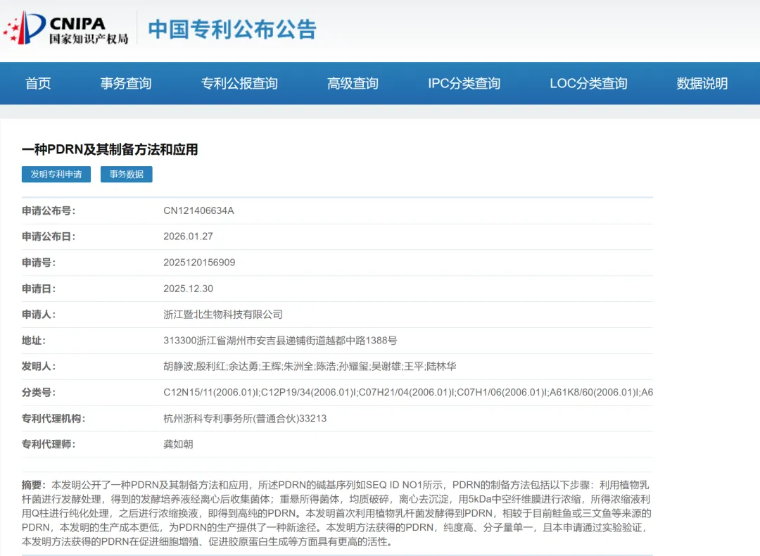 2026年1月27日,浙江暨北生物科技有限公司(以下简称“暨北生物”)公开了一项利用生物发酵技术制备PDRN的专利,专利名称为“一种PDRN及其制备方法和应用”(CN121406634A)。为PDRN的生产摆脱动物资源的依赖提供又一技术支撑,有望进一步向微生物发酵的可持续、低成本、高活性方向转型。
