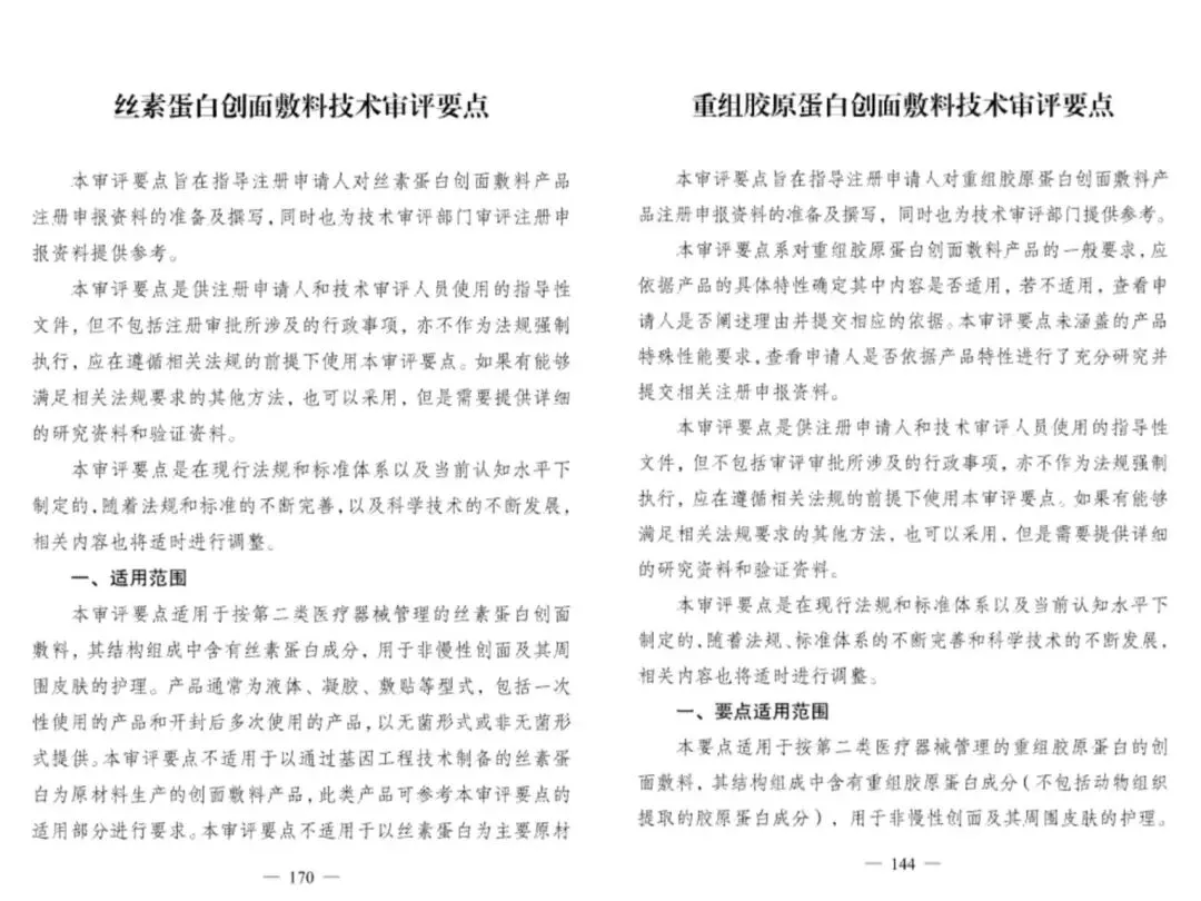 《丝素蛋白创面敷料技术审评要点》、《重组胶原蛋白创面敷料技术审评要点》发布