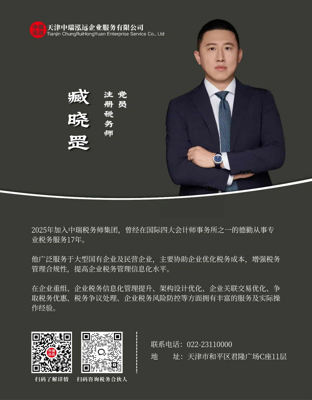 2025年加入中瑞税务师集团,曾经在国际四大会计师事务所之一的德勤从事专业税务服务17年。