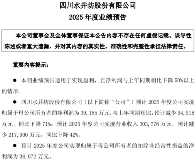 以水井坊为例,2024年的营收、净利润还在增长,到2025年,不仅没有保持住原有的增长势头,反而出现了严重下滑,预计实现营收30.38亿元,同比减少21.79亿元,下降42%;净利润预计约为3.92亿元,同比减少9.49亿元,下降71%。
