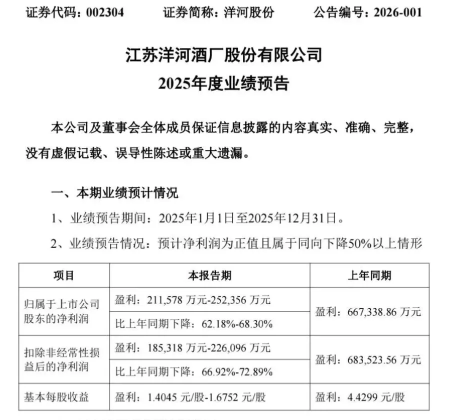 值得注意的是,洋河股份的业绩预告同样触目惊心,预计2025年净利润21.2亿元至25.2亿元,相较2023年的66.73亿元大幅下滑。