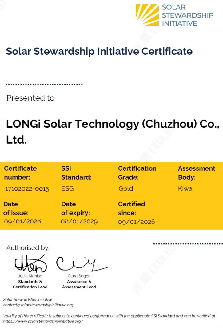 1月10日,隆基绿能实现了这一具有里程碑意义的成就,这不仅是对其长期致力于绿色制造、社会责任和透明治理的顶级褒奖,也代表着隆基绿能在环境、社会及治理(ESG)领域达到全球领先水平,为光伏行业树立了可持续发展的新标杆。长期以来,隆基绿能始终将SSI标准深度融入企业发展战略,在多个关键领域实现了创新突破,持续为全球客户提供可信赖的绿色产品,更推动了全球可持续发展进程。隆基绿能相关负责人表示,将持续以技术创新为引擎,推动光伏行业从“能源替代”迈向“能源革命”,在全球能源转型与零碳未来的进程中注入中国智慧。