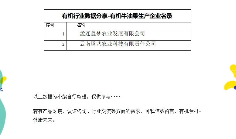 中国牛油果在云南(普洱、孟连、西双版纳)、广西、四川、海南、广东等地均有种植,其中云南孟连县种植面积超10万亩,已成为全国最大产区,但都还未形成产业规模。,目前,经过中国有机认证的牛油果生产加工企业共有2家,具体如下: