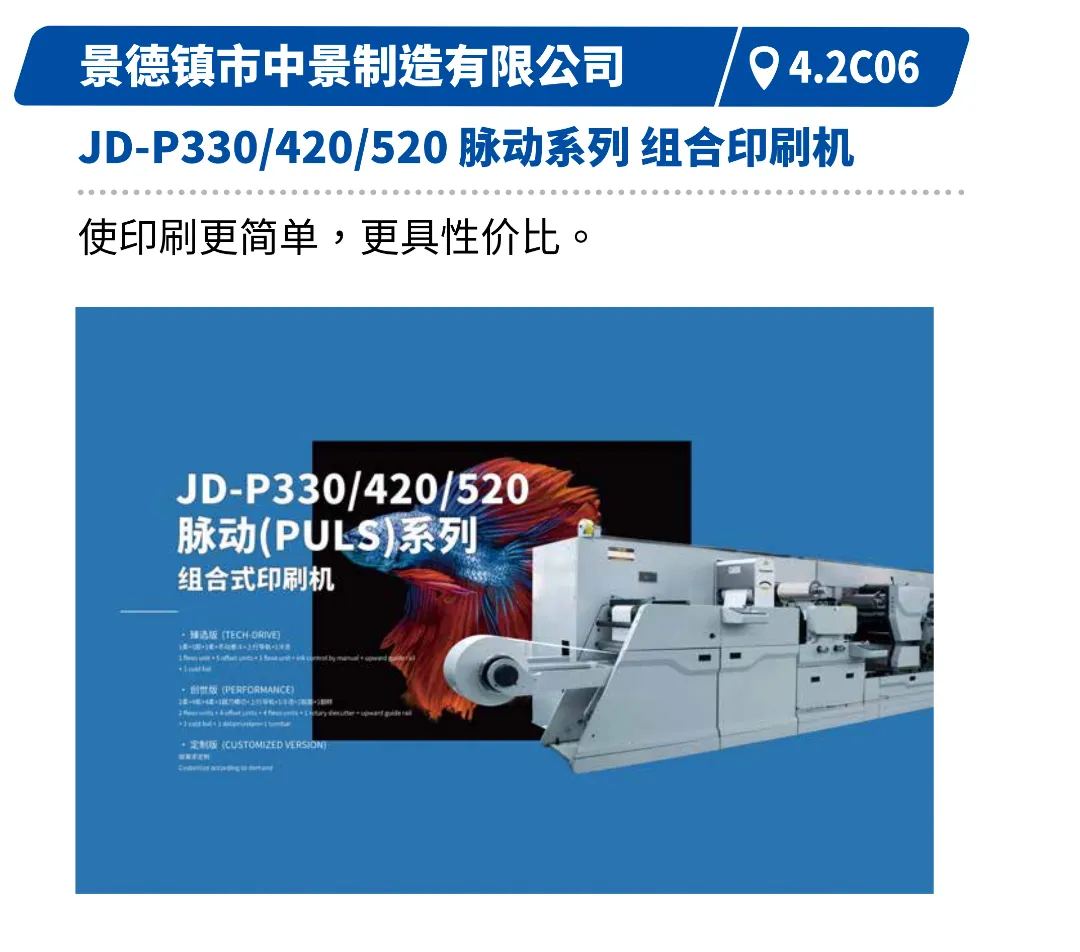 展示胶印、柔印、数码等多工艺一体化创新方案,通过模块化设计实现一机完成复杂工序。如上海通印的数柔一体机、中景的组合印刷机、力冠的组合式数码印后加工机等,将展示其在应对多样订单、缩短生产周期、降低流转成本方面的显著优势。