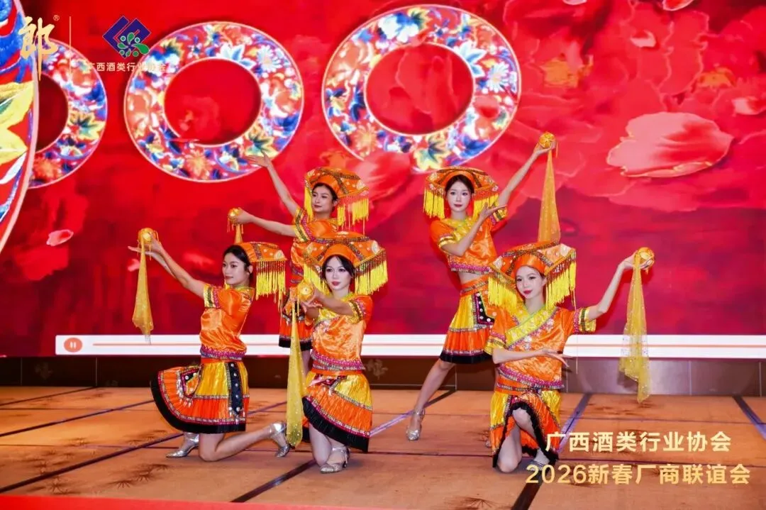 晚会在一曲极具广西地域特色的开场舞《欢乐壮乡》中拉开序幕。身着绚丽壮锦服饰的演员们踏着铜鼓节拍翩翩起舞,绣球翻飞间传递着热情与祝福。开场舞后,广西酒类行业协会会长黄木坚、郎酒股份红花郎事业部副总经理赵雷先后登台致辞。