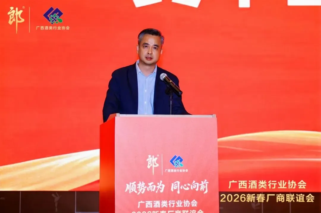 黄木坚在致辞中回顾了2025年广西酒业的发展历程。他指出,过去一年,面对复杂多变的市场环境,广西酒业在风浪中坚守、在变革中前行,面对行业深度调整的挑战与消费市场的结构性变化,广西全体厂商同心同德、携手并肩,用坚守与智慧书写了酒业发展的坚实答卷。他表示,“厂为基石、商为桥梁”,两者是牢不可破的利益共同体。在当前形势下,厂商唯有“心相通,情相融”,凝聚共识,方可谋共赢。