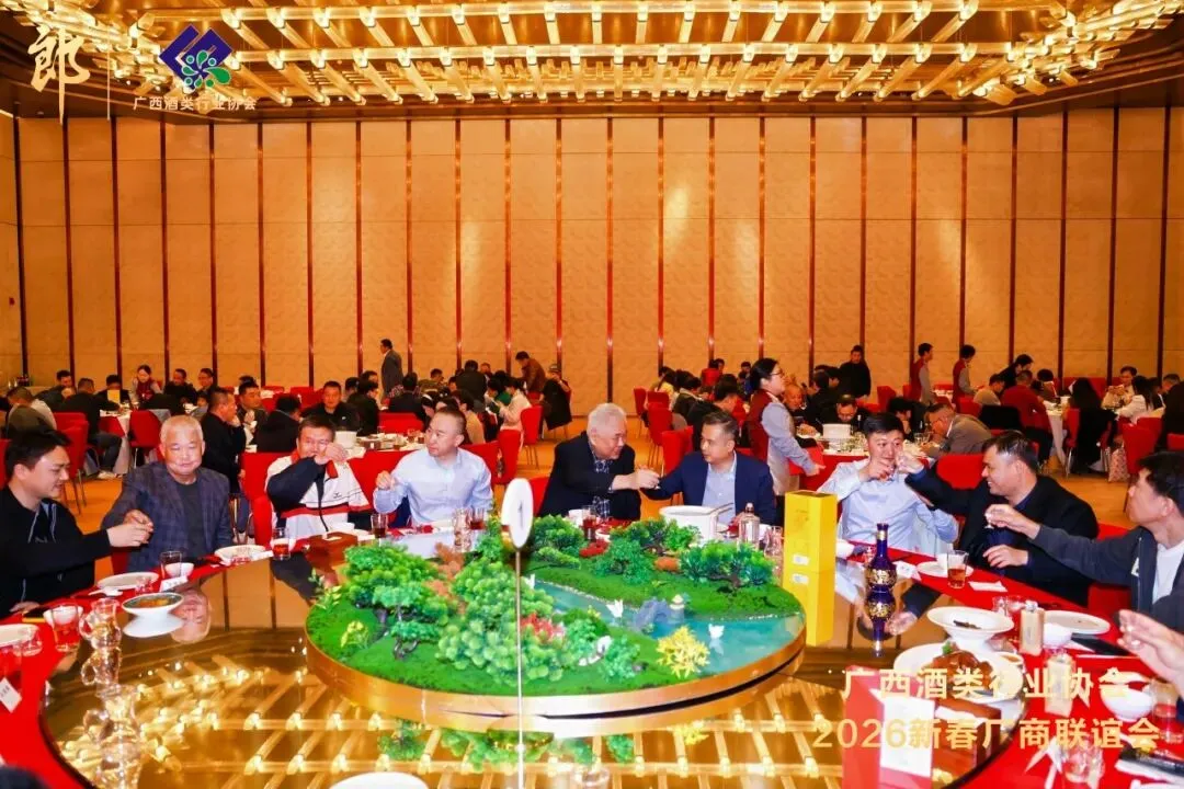 万里鹏程驰骏马,九州春色醉东风。1月27日晚,广西酒类行业协会2026新春厂商联谊会在首府南宁圆满举行,广西酒业界名酒厂商与经销商朋友一道160多人欢聚一堂,共叙情谊,共度联欢。