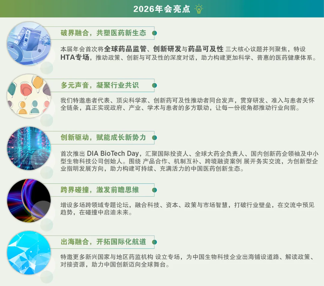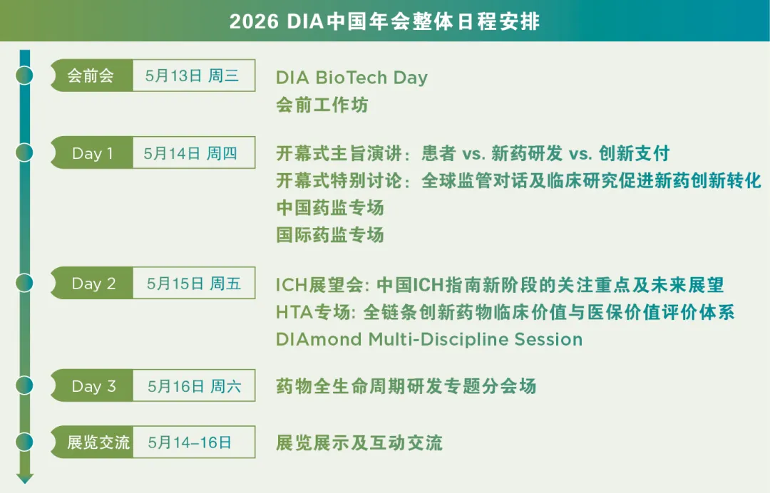 2026 DIA药物信息大会暨展览会将于2026年5月13-16日在上海张江科学会堂启航!请您锁定日程,共同参与这一生命科学领域的顶级盛会。作为全球化合作、监管创新、科技创新及人才创新的领航者与坚实后盾,我们致力于打破地缘壁垒与文化差异,为医疗健康领域的未来可持续发展注入无限能量。大会汇聚生命科学各界精英,倡导开放合作,提升中国新药研发转化硬实力,与全球业界同仁以智汇为驱动,融合共赢,共同迈向医药研发新生态