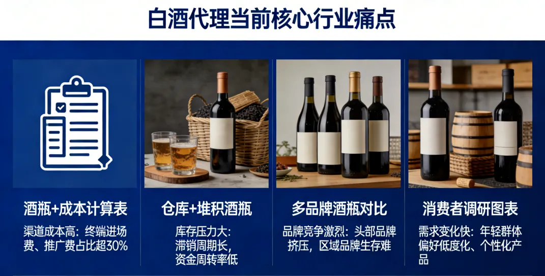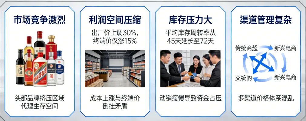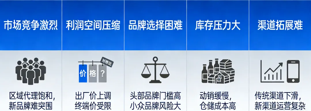 当前白酒代理行业正处于深度调整期,叠加市场环境变化与行业格局重塑,代理商普遍面临多重经营困境,核心痛点集中在资金、货源、利润、运营、市场等五大核心环节,具体如下: