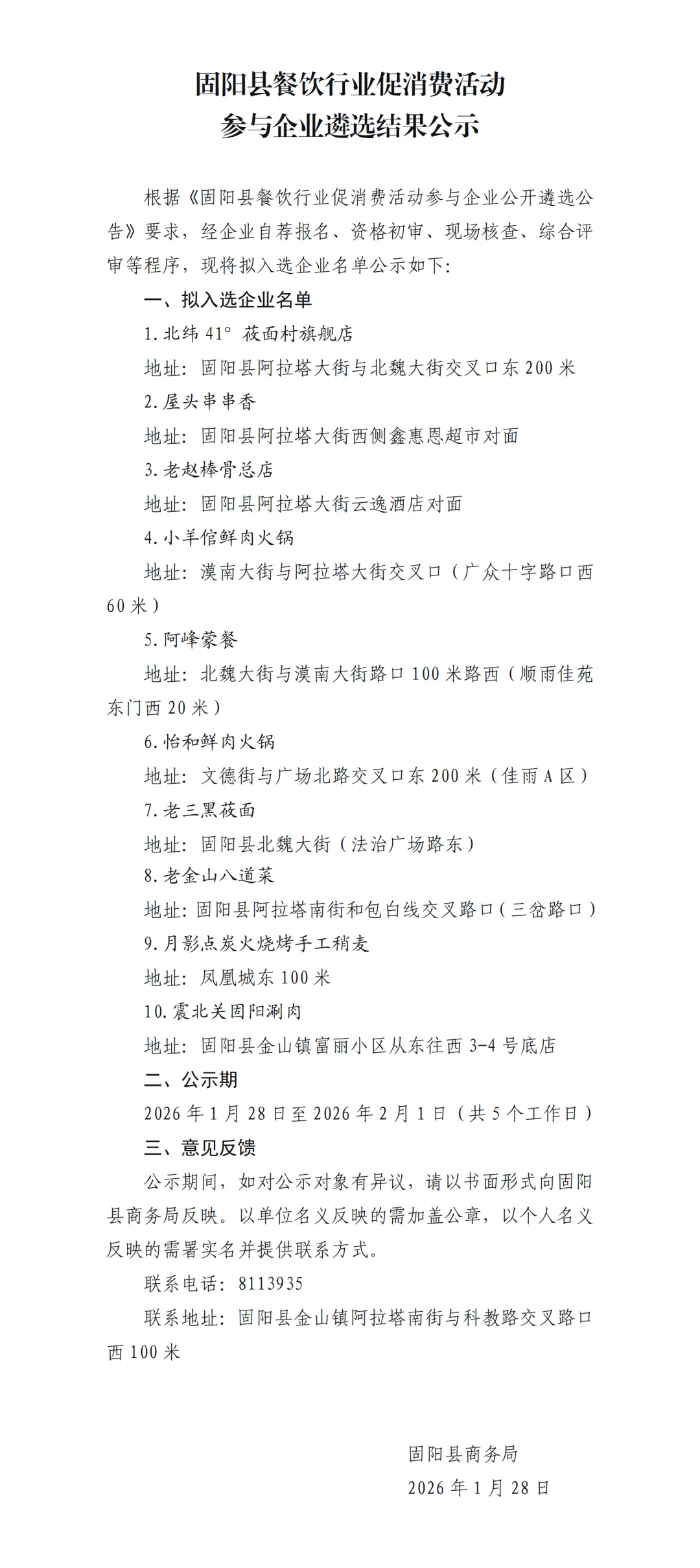 固阳县餐饮行业促消费活动参与企业遴选结果公示