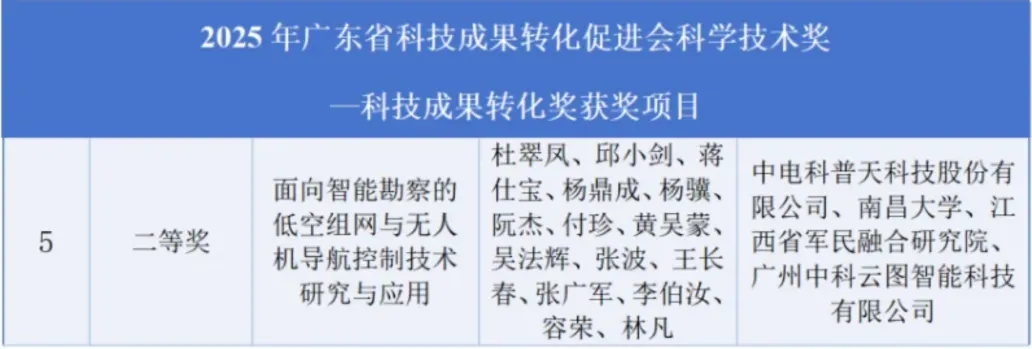 中科云图参与的“面向智能勘察的低空组网与无人机导航控制技术研究与应用”项目,荣获广东省科技成果转化促进会2025年度科学技术奖“科技成果转化奖”二等奖。