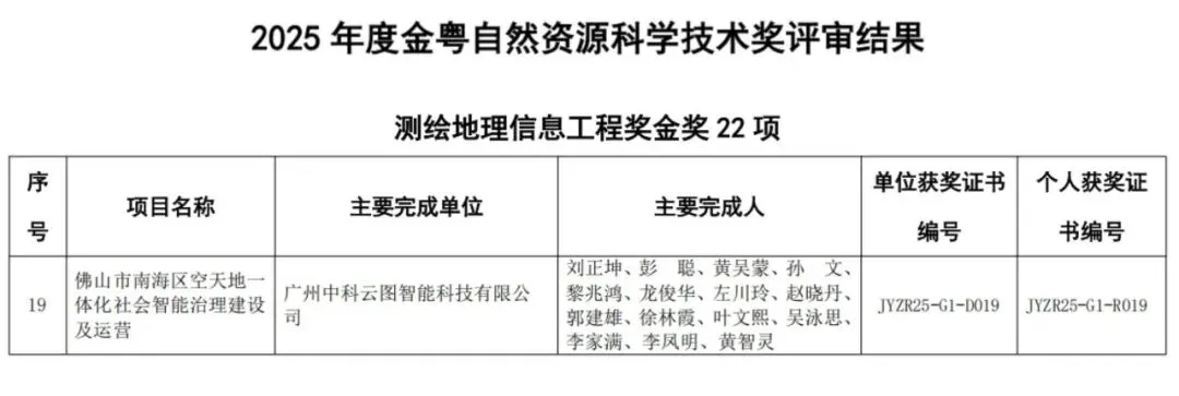 由中科云图深度参与并提供关键技术与服务支撑的“佛山市南海区空天地一体化社会智能治理建设及运营”项目,荣获2025年度“金粤测绘地理信息工程金奖”。