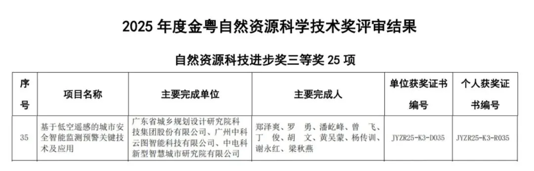 中科云图参与的“基于低空遥感的城市安全智能监测预警关键技术及应用”项目,荣获2025年度“金粤自然资源科技进步奖”三等奖。