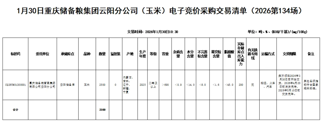 受重庆储备粮管理集团有限公司云阳分公司委托,重庆市粮油批发市场有限责任公司(即国家粮食重庆交易中心,以下简称“批发市场公司”)定于2026年1月30日10:30举办重庆储备粮集团云阳分公司(玉米)电子竞价采购交易会,现将有关事项公告如下: