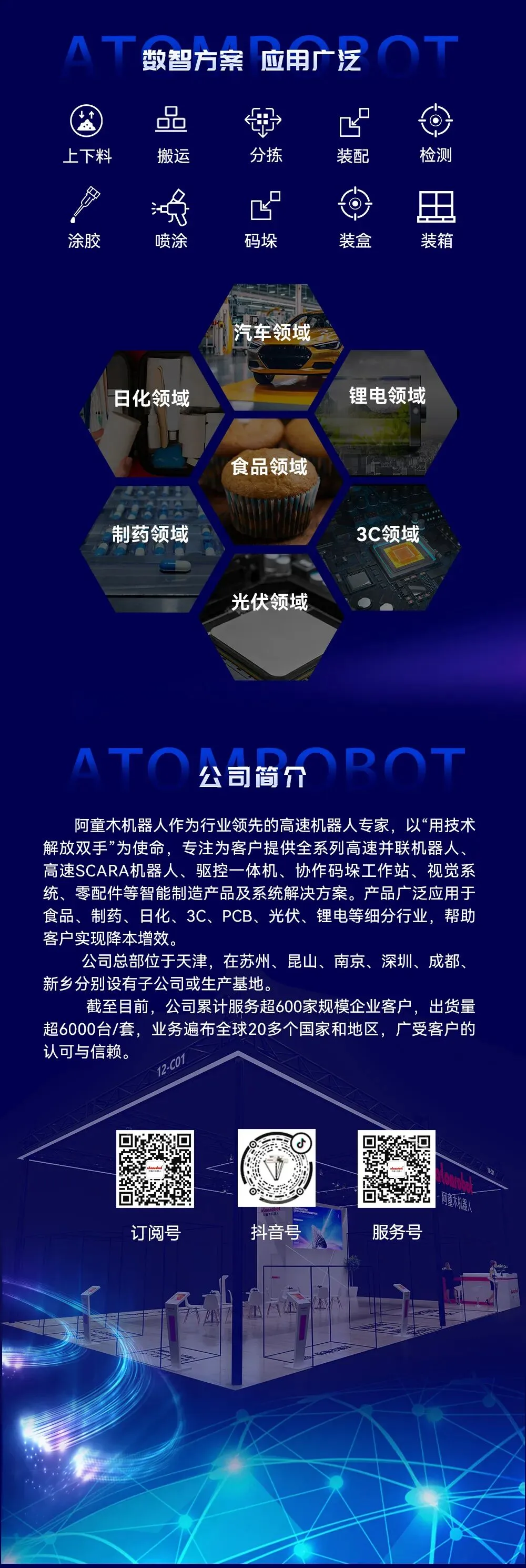 ●阿童木机器人携系列高端智能装备及创新性自动化方案重磅出展。围绕“高端装备·精密智造·工业技术·智能制造”展览内容,现场实力演绎机器人分拣、搬运、检测、装箱、码垛等工艺方案,蓄势赋能新质生产力。